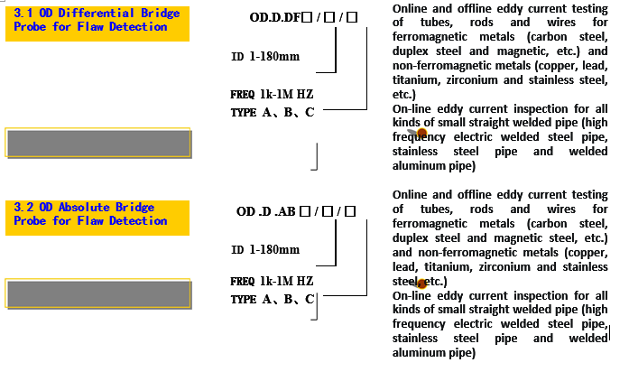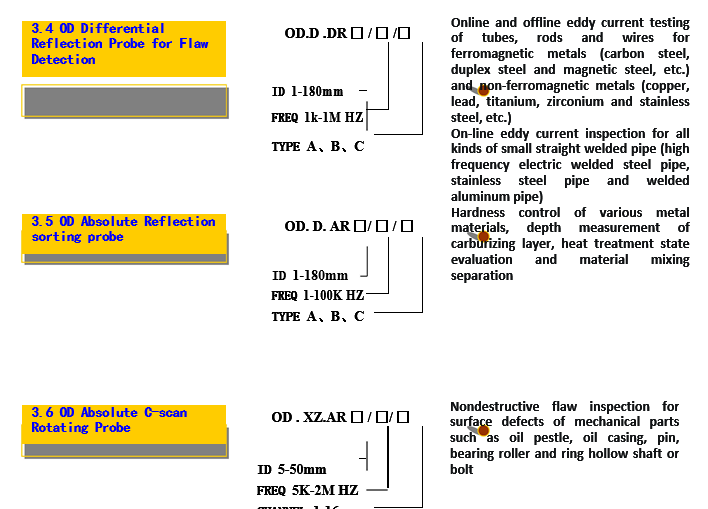 The probes we provide include: Differential, Absolute,Reflection,and Drive pick-up.Usually the standard probe series can meet the requirements of most customers' applications, such as the detection and evaluation of surface defects, the detection of internal cracks in bolt holes, Heat exchanger pipe corrosion crack and wear thinning, multi-layer structure corrosion and ferromagnetic weld crack detection. When customers have special testing requirements or do not know much about the probe's specifications and function selection, please provide the following information, we will give the recommended selection: